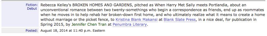 Rebecca Kelley’s BROKEN HOMES AND GARDENS, pitched as When Harry Met Sally meets Portlandia, about an unconventional romance between two twenty-somethings who begin a correspondence as friends, end up as roommates when he moves in to help rehab her broken-down first home, and who ultimately realize what it means to create a home without marriage or the picket fence, to Kristina Blank Makansi at Blank Slate Press, in a nice deal, for publication in Spring 2015, by Jennifer Chen Tran at Penumbra Literary.